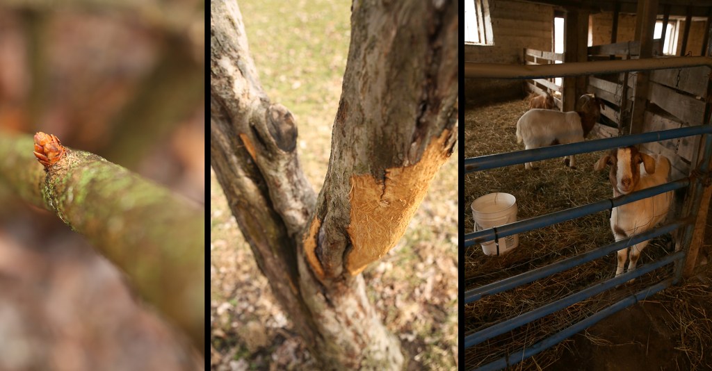 We played outside, found hopeful buds, & some not-so-cool reasons to be happy the goats are in the barn until Spring-no longer able to access our old and generous Apple trees. Another project that was suppose to be done last Spring-finishing their fencing around the barn. This year, this year, we will chant as we narrow down the list.
