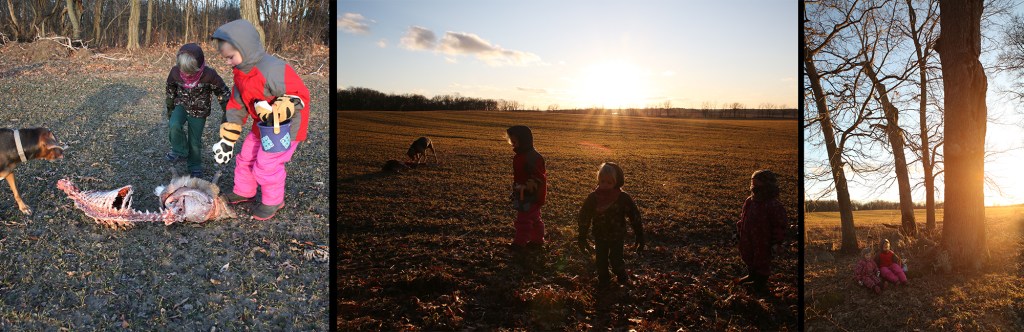 Lilly and I spent some time playing with our new blending tools this morning. Then, just before dinner, she was staring out to the field and noticed something big. Turned out, after getting out the scope, it was an Osprey eating a deer carcass. So, we layered up and went for a hike to check it out. As we pieced together the scene, the Osprey took off over our heads. Cold-we discussed the signs of frostbite in hurried voices, then started back with the white deer tail as a souvenir and picked some rose hips on the way for tea when we returned.