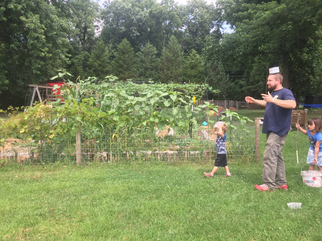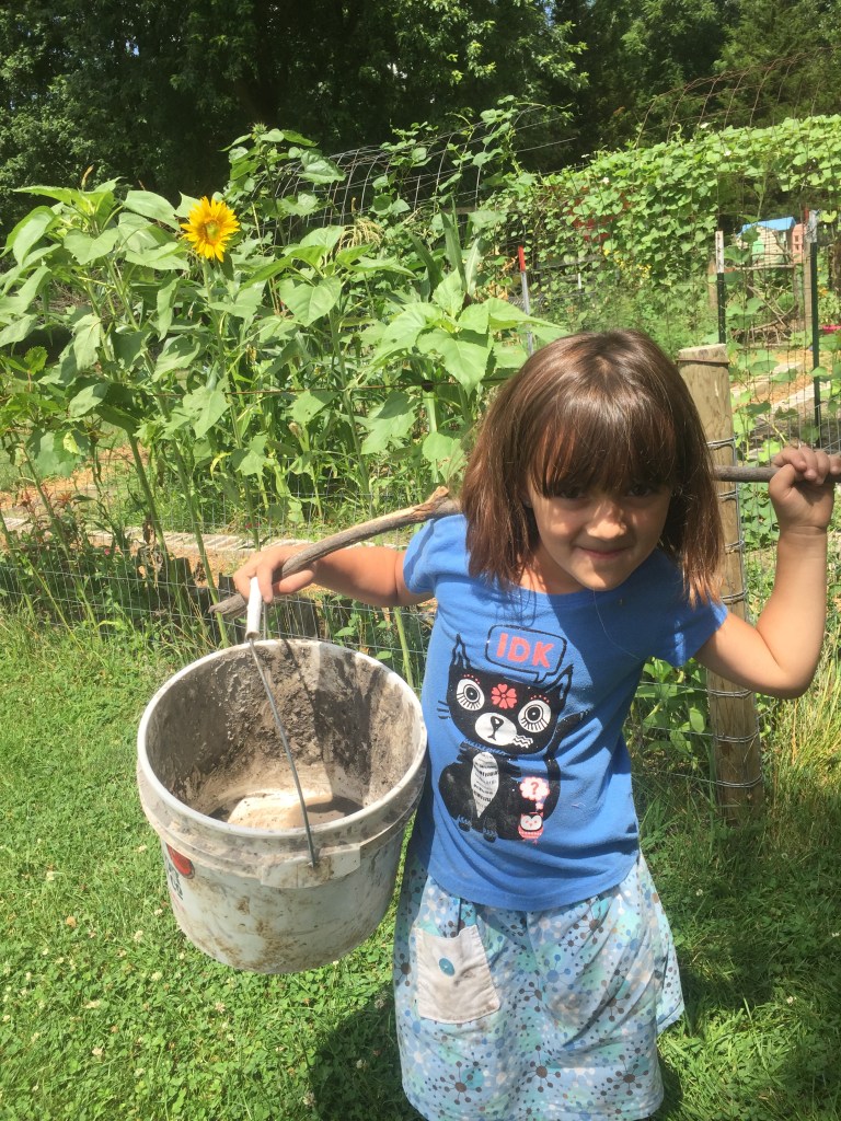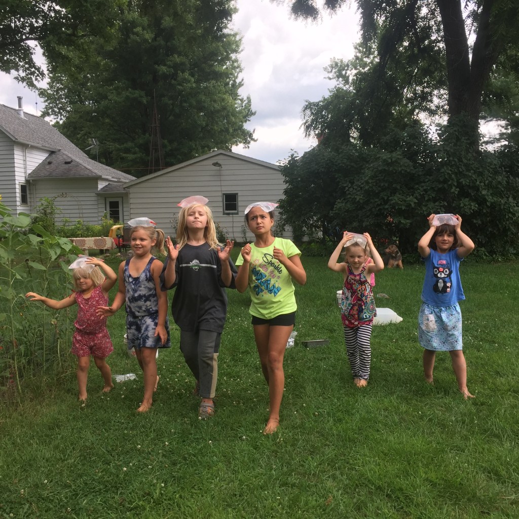 We came up with a plan to search the yard for different vessels to contain & try to carry the water, without loosing a precious drop! The kids came up with lots of clever ways to carry it from here to there & then we turned it into a game where they could only hold it on their heads, couldn’t use their hands, & had to travel across the ‘dessert’ to bring water to their loved ones.